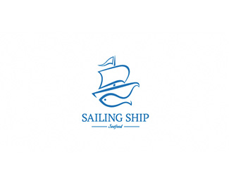 SAILINGSHIP海鮮公司標(biāo)志,以線條的方式融入帆船和魚的元素構(gòu)成該公司的識(shí)別圖形,藍(lán)色是識(shí)別色。