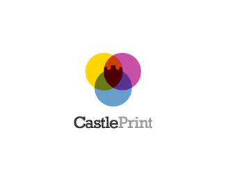 Castle Print城堡打印公司標志設計欣賞,使用3個圈圈層疊融入城堡元素作為該標志的主識別圖形,使用了豐富的色彩搭配。