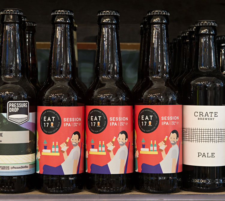 這種說明性的風(fēng)格貫穿了商店的招牌、制服和食品包裝,包括Eat 17的新一期IPA工藝啤酒,它描繪了兩個人都在享受啤酒。